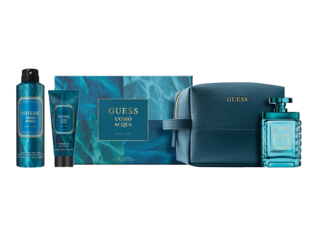 Guess Uomo Aqua EDT לגבר הוא ניחוח רענן, נקי ודינמי בהשראה ימית, המיועד לגבר שאוהב תחושת חופש, אנרגיה וסטייל מודרני. מארז המתנה כולל את הבושם בנפח 100 מ״ל, יחד עם דאודורנט ספריי 170 מ״ל ו־ג׳ל רחצה 100 מ״ל, לחוויית טיפוח מלאה מהבוקר ועד הערב.