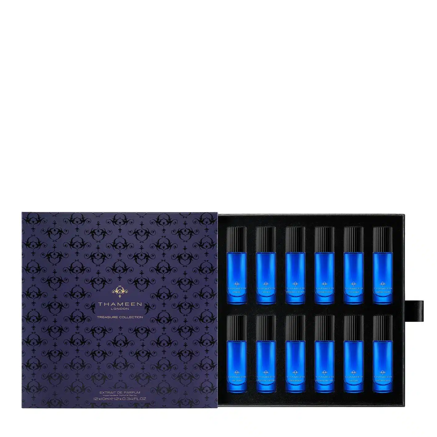 סט הכולל 12 בשמים אקסטרט דה פרפיום 10 מ”ל: Amber Room,Blue Heart, Carved Oud, Green Pearl, Noorolain Taif, Patiala, Peregrina, Peacock Throne, Regent Leather, Riviere, The Cora, The Hope